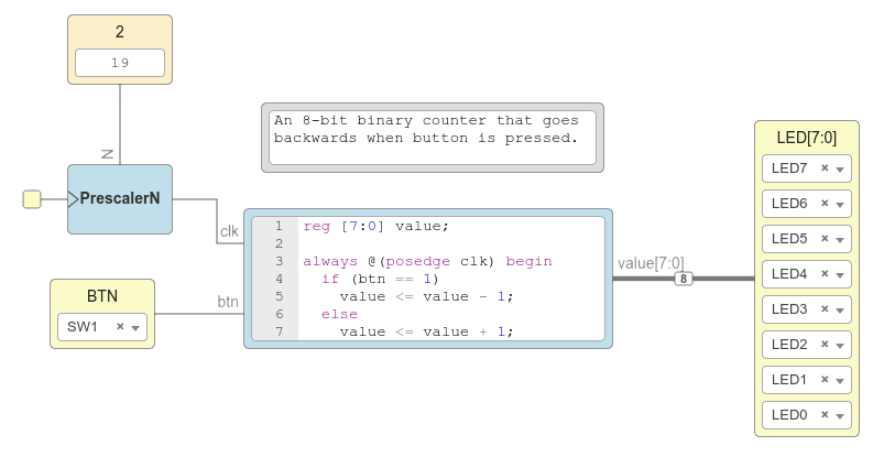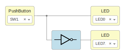 It's a great way to build little circuits to get a feeling for the FPGA. For example the following circuit will light LED 0 if the button 1 is pushed, otherwise LED7 would be the one active.